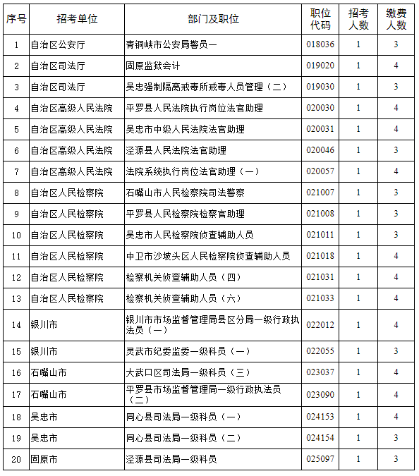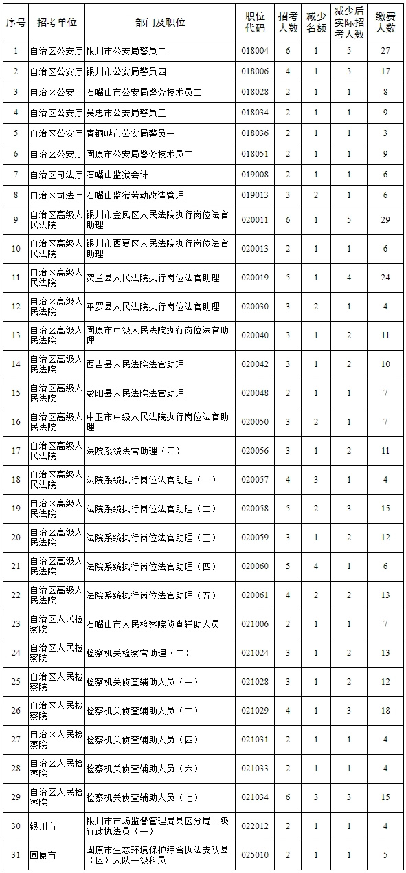 2023年全區(qū)考試錄用公務(wù)員網(wǎng)上報名、資格初審及繳費(fèi)工作結(jié)束后,有部分職位未達(dá)到筆試開考比例。根據(jù)《寧夏回族自治區(qū)2023年考試錄用公務(wù)員公告》中“筆試開考比例(職位有效報名人數(shù)與招錄名額之比)一般為5: 1。定向招考職位、專業(yè)性較強(qiáng)、生源較少的特殊職位以及艱苦邊遠(yuǎn)地區(qū)招考職位筆試開考比例可降至3:1,公安系統(tǒng)法醫(yī)、監(jiān)獄機(jī)關(guān)獄醫(yī)等專業(yè)性強(qiáng)的職位筆試開考比例可降至2:1。達(dá)不到筆試開考比例的職位,減少招考名額或取消招考計(jì)劃。招考計(jì)劃取消的,報考該職位的考生可改報其他符合條件的職位”的規(guī)定,經(jīng)研究,取消、減少部分職位招考名額,降低部分職位筆試開考比例。具體如下: