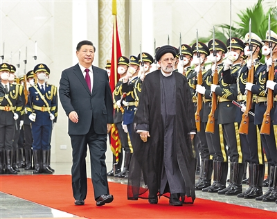 天安門廣場鳴放21響禮炮,禮兵列隊致敬。兩國元首登上檢閱臺,軍樂團奏中伊兩國國歌。萊希在習近平陪同下檢閱中國人民解放軍儀仗隊,并觀看分列式。