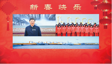 2023年1月18日,中共中央總書記、國家主席、中央軍委主席習近平在北京通過視頻連線看望慰問基層干部群眾,向全國各族人民致以新春的美好祝福。這是習近平通過視頻連線,同塔里木油田公司輪南油氣儲運中心西氣東輸?shù)谝徽究死瘹鈪^(qū)員工親切交流。新華社記者李濤/攝