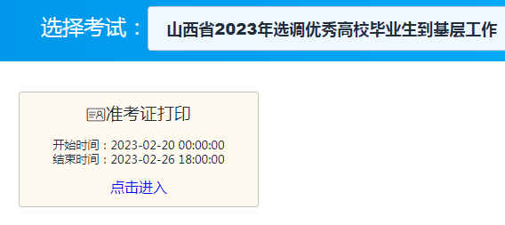 點(diǎn)擊進(jìn)入:2023年山西公務(wù)員考試準(zhǔn)考證打印入口(2月20日至2月26日)
