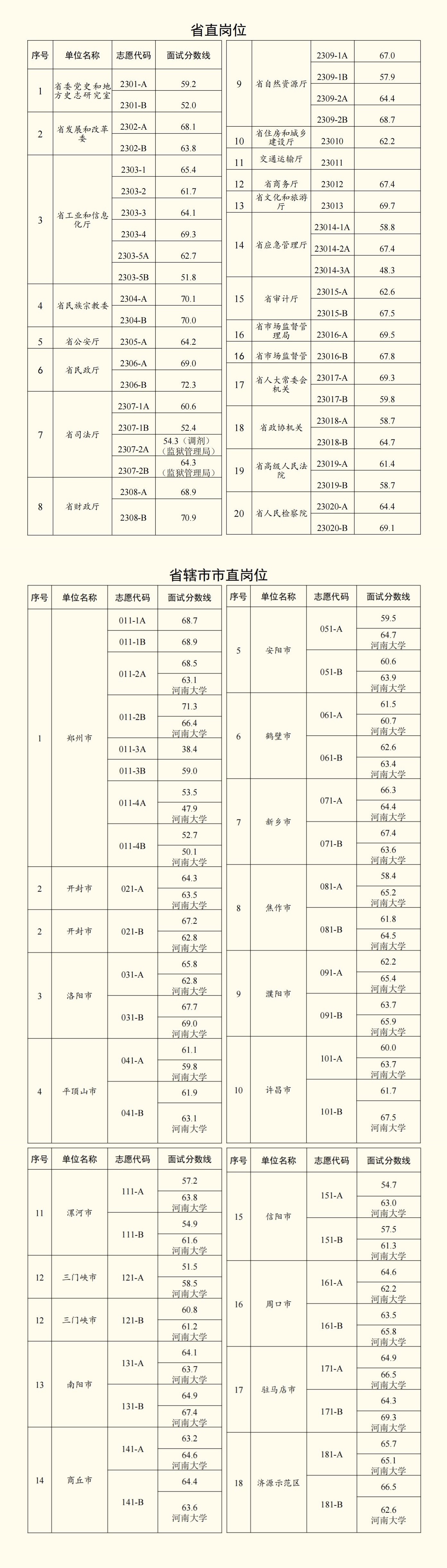 面試時(shí)間定于2023年3月4日,報(bào)考省直單位和鄭州市的考生在鄭州面試,報(bào)考其他省轄市的考生在所報(bào)考省轄市面試,具體時(shí)間地點(diǎn)另行通知。