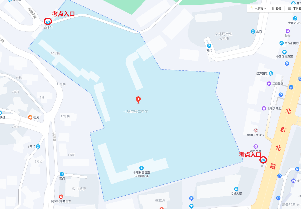 考點(diǎn)入口:北京北路十堰市第二中學(xué)(東門)(北京北路,十堰市教育局對面)和十堰市第二中學(xué)(西北門)(老虎溝)。