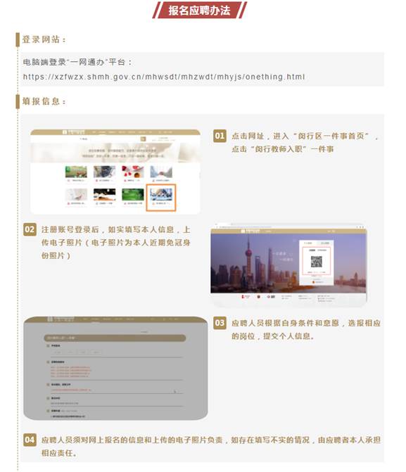 4、錄用手續(xù)辦理:經(jīng)學(xué)校綜合測(cè)試合格者,同時(shí)必須符合閔行區(qū)教師招聘條件(請(qǐng)應(yīng)聘者務(wù)必在規(guī)定時(shí)間內(nèi)上閔行教師招聘官網(wǎng)上報(bào)名,報(bào)名方法見(jiàn)下圖),完成并通過(guò)閔行區(qū)教師招聘考試者,按事業(yè)單位規(guī)定程序正式錄用。