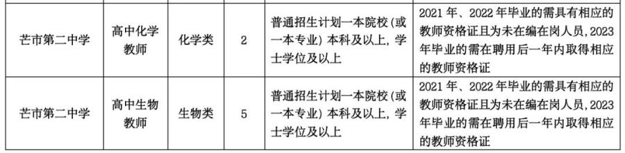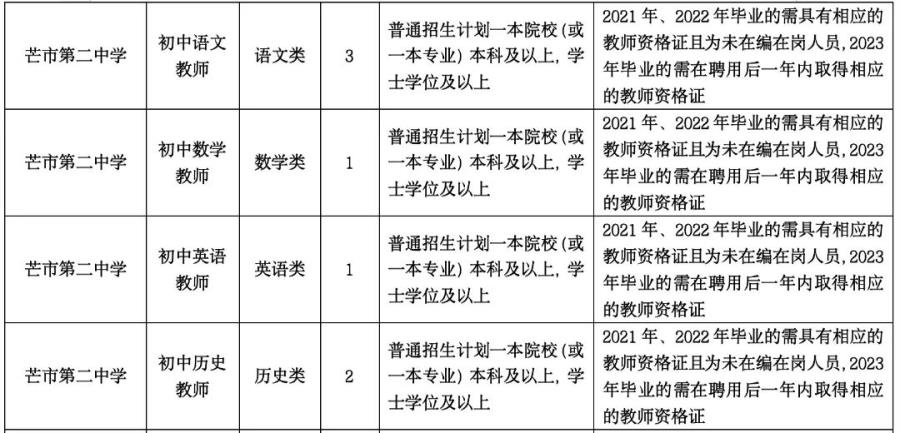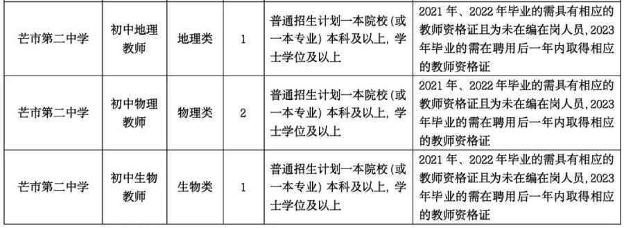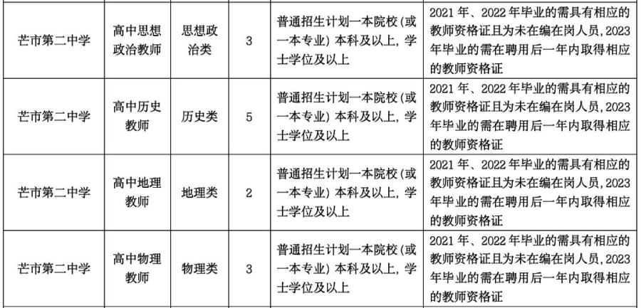 2.2021年、2022年、2023年畢業(yè),所學(xué)專業(yè)與招聘教學(xué)崗位要求相符,普通招生計(jì)劃一本院校(或一本專業(yè))學(xué)士學(xué)位及以上學(xué)歷優(yōu)秀畢業(yè)生(未在編在崗,在校期間總體成績(jī)優(yōu)異,所學(xué)專業(yè)必修科目無掛科,2021年、2022年畢業(yè)的需具有相應(yīng)的教師資格證,2023年畢業(yè)的需在聘用后一年內(nèi)取得相應(yīng)的教師資格證,未取得的解除聘用合同)。