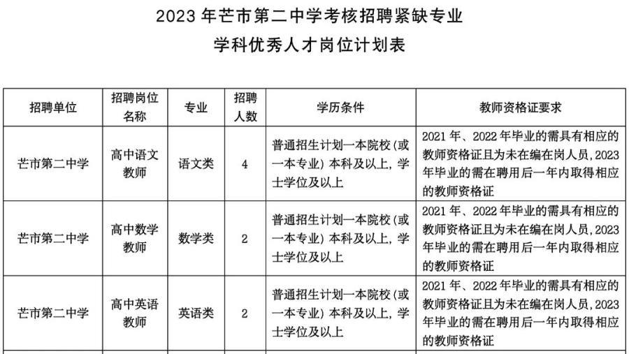 3.具體崗位條件詳見《2023年芒市第二中學(xué)考核招聘緊缺專業(yè)學(xué)科優(yōu)秀人才崗位計(jì)劃表》。
