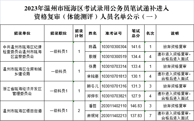 2023年溫州市甌海區(qū)考試錄用公務員筆試遞補進入資格復審(體能測評)人員名單公示(一)