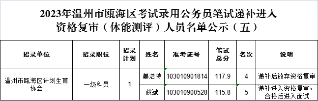 2023年溫州市甌海區(qū)考試錄用公務員筆試遞補進入資格復審(體能測評)人員名單公示(五)