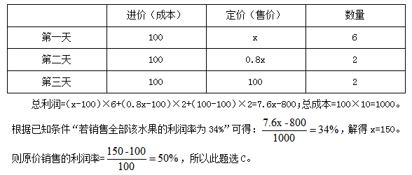 例2:超市銷售某種水果,第一天按原價(jià)售出總量的60%,第二天原價(jià)打八折售出剩下的一半,第三天按成本價(jià)全部售出。若銷售全部該水果的利潤率為34%,則該水果按原價(jià)銷售的利潤率為:( )