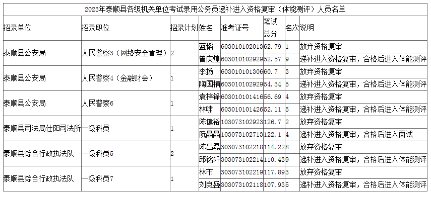 2023年泰順縣各級(jí)機(jī)關(guān)單位考試錄用公務(wù)員遞補(bǔ)進(jìn)入資格復(fù)審(體能測評(píng))人員名單