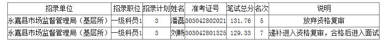 2023年浙江公務(wù)員考試溫州永嘉縣遞補資格復(fù)審人員名單(一)