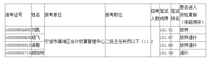 關于公布2023年鎮(zhèn)海區(qū)各級機關單位考試錄用公務員放棄資格復審(體能測評)及遞補人員名單的公告(二)
