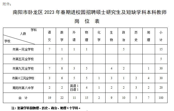 進(jìn)校園公開招聘教師100名。具體崗位詳見《南陽市臥龍區(qū)2023年春期進(jìn)校園招聘碩士研究生及短缺學(xué)科本科教師崗位表》(見附件)。