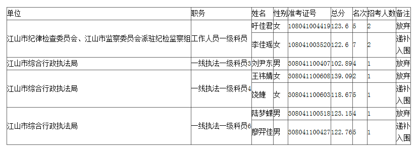 2023年浙江公務(wù)員考試衢州江山市放棄和遞補(bǔ)資格復(fù)審人員名單公布