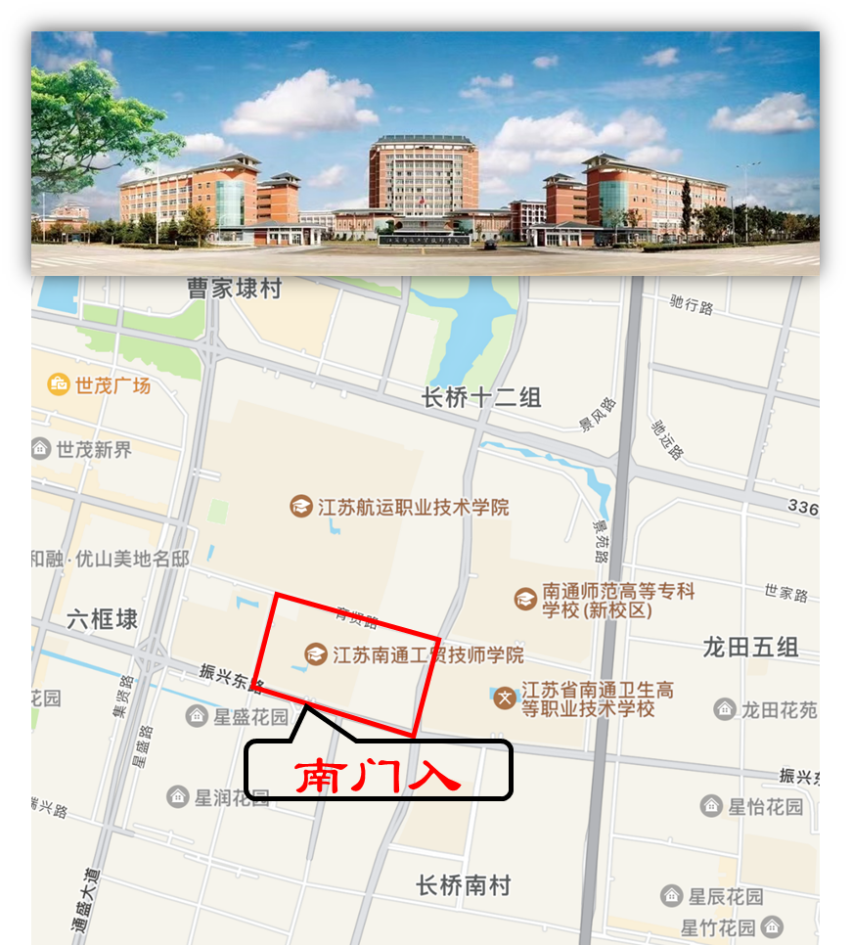 本次江蘇省公務(wù)員招錄面試南通考區(qū)考點設(shè)在江蘇省南通工貿(mào)技師學(xué)院(南通經(jīng)濟(jì)技術(shù)開發(fā)區(qū)振興東路296號),請從南大門進(jìn)校。具體如圖所示: