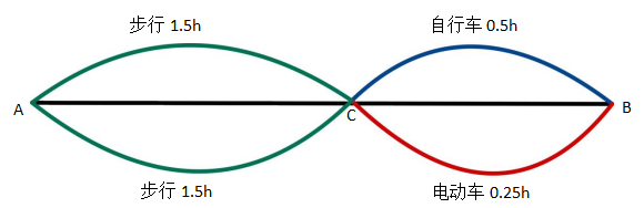 小明的步行速度為1米/秒,從A到B地步行需要3小時,騎自行車需要1小時,電動車的速度是自行車速度的兩倍,現(xiàn)在小明從A地出發(fā),步行1.5小時后騎自行車到B地,然后返回途中先騎電動車走完一半路程,再步行返回A地,則小明往返A(chǔ)、B兩地共用多少小時?( )