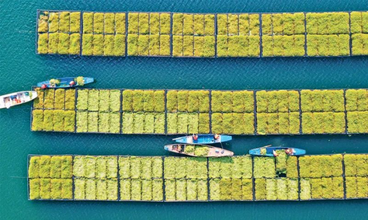 浙江省杭州市淳安縣在千島湖典型庫(kù)灣、入湖口等區(qū)域,運(yùn)用生態(tài)浮島水上無(wú)土栽培技術(shù)種植水生蔬菜,努力探索“兩山”價(jià)值轉(zhuǎn)化新路徑。圖為2023年2月21日,工作人員正在采摘水生蔬菜。人民圖片楊波/攝