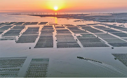 近年來(lái),山東省榮成市大力推行科技興海、以養(yǎng)興漁,積極推廣“淺海多營(yíng)養(yǎng)層次生態(tài)養(yǎng)殖模式”。圖為石島管理區(qū)桑溝灣海洋牧場(chǎng)網(wǎng)箱養(yǎng)殖區(qū)(2023年2月16日攝)。人民圖片李信君/攝