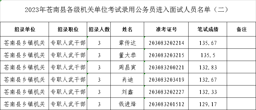 2023年蒼南縣各級機關單位考試錄用公務員進入面試人員名單(二)