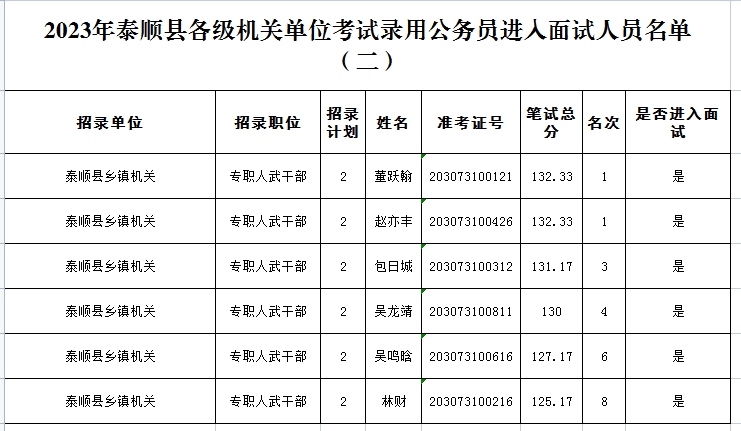 2023年泰順縣機關單位考試錄用公務員筆試進入面試人員名單(二)