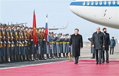 俄方在機場舉行隆重迎賓儀式。軍樂團奏中俄兩國國歌。習(xí)近平檢閱俄羅斯三軍儀仗隊并觀看分列式。