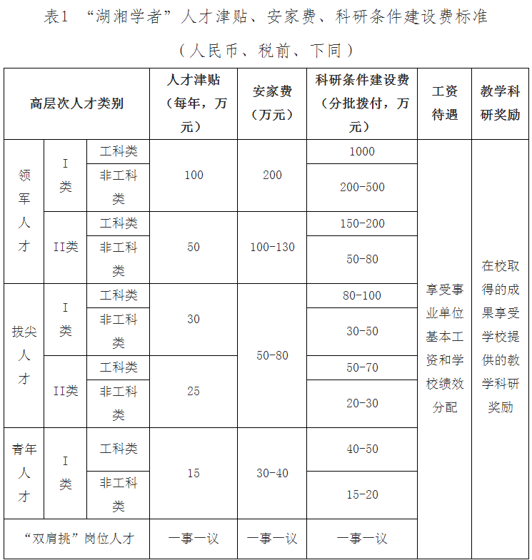 1.高層次人才按照《長沙理工大學(xué)“湖湘學(xué)者”人才計劃實施辦法》(長理工大黨〔2022〕45 號)確定薪酬待遇(見表1),提供相應(yīng)安家費和科研啟動費,并提供免費過渡性住房保障。