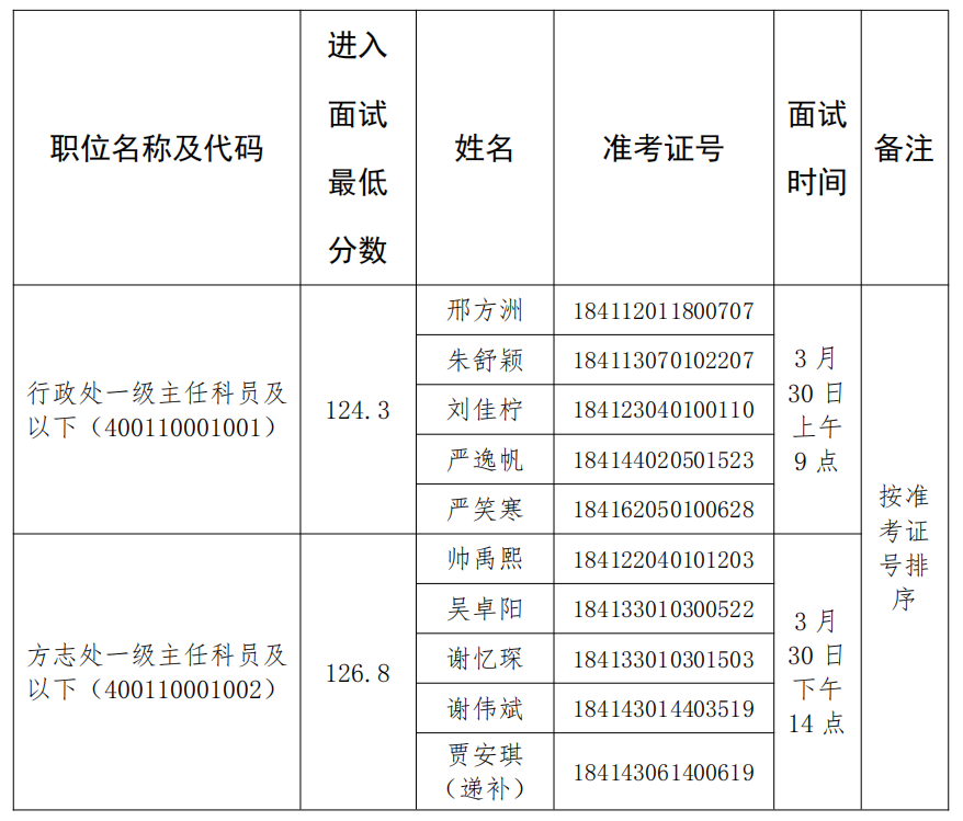 行政處一級主任科員及以下崗位(400110001001)面試于2023年3月30日(周四)上午9:00開始,方志處一級主任科員及以下崗位(400110001002)面試于2023年3月30日(周四)下午14:00開始,請參加面試的考生于當(dāng)日提前30分鐘到面試地點(diǎn)報(bào)到。不按規(guī)定時(shí)間進(jìn)入候考室的考生,取消考試資格。