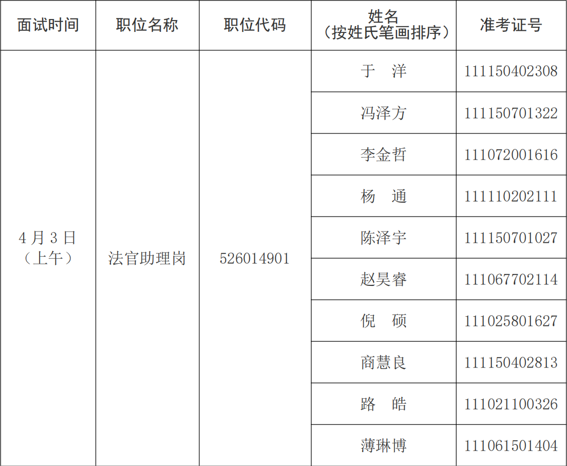 請考生按照面試時間安排,于本人面試當天上午8:00或下午13:00前,到面試候考室北京市大興區(qū)人民法院C座三樓第二會議室報到,參加面試。需參加專業(yè)能力測試的考生,還應在3月25日13:00前,到北京市大興區(qū)人民法院執(zhí)行指揮中心報到,參加專業(yè)能力測試。未按時報到的,視為自動放棄。