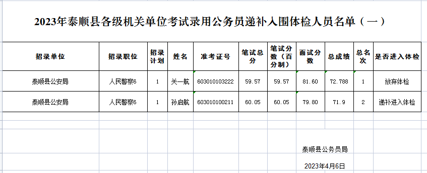 2023年浙江公務(wù)員考試溫州泰順縣遞補(bǔ)入圍體檢人員名單(一)