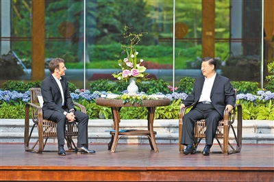 兩位元首臨水而坐,觀景品茗,縱論古今。