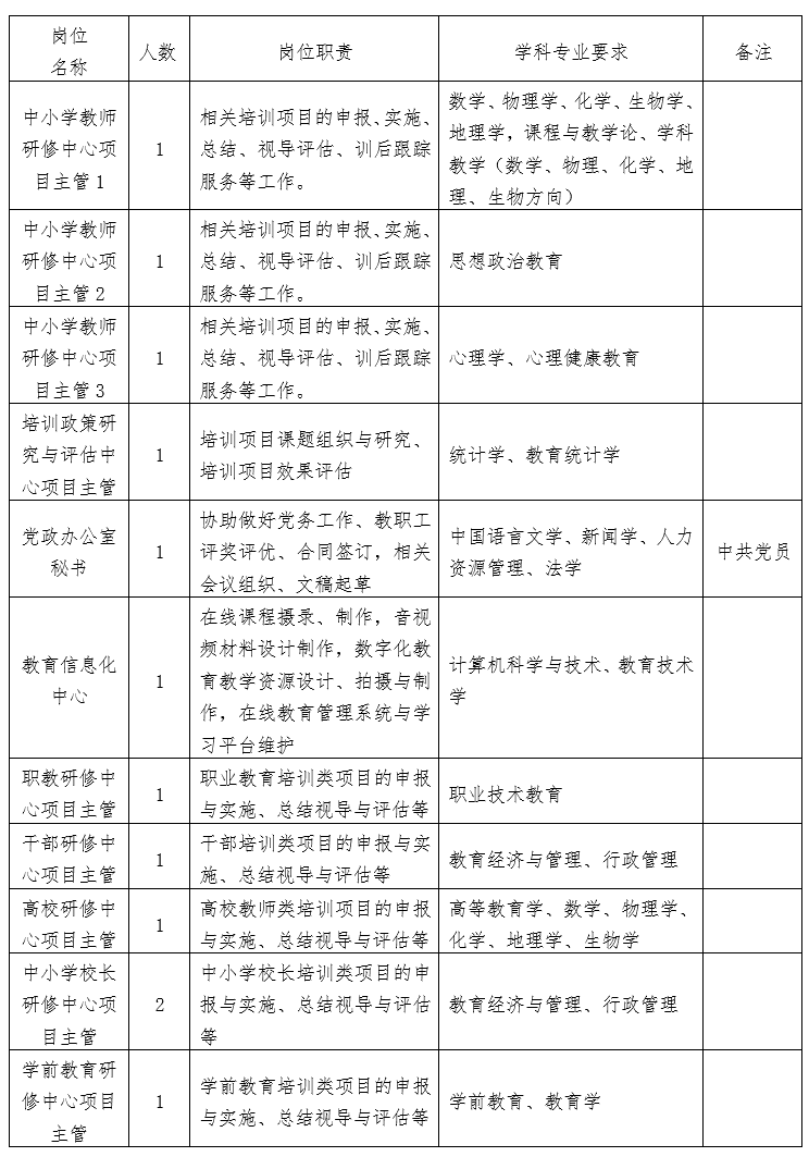 本次招聘崗位不占用學校事業(yè)編制,聘用人員與教師干部培訓學院簽訂固定期限勞動合同。