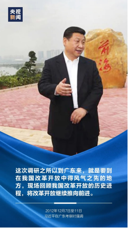 在廣東深圳,有兩棵“有故事”的高山榕樹。一棵在仙湖植物園,是1992年1月,鄧小平視察深圳時種下的。一棵在蓮花山公園,是2012年12月,習(xí)近平總書記赴廣東考察時種下的。如今,兩棵高山榕樹遙遙相望,在中國改革開放的前沿陣地,茁壯成長、枝繁如蓋,展現(xiàn)出蓬勃的生機和活力。廣東是改革開放的排頭兵、先行地、實驗區(qū)。黨的十八大以來,習(xí)近平總書記四次赴廣東考察,都正值黨和國家事業(yè)前進的重要節(jié)點,也都提到了兩個關(guān)鍵詞——改革和開放。2012年12月,黨的十八大后首次離京考察,習(xí)近平總書記就來到廣東,循著先輩的足跡,發(fā)出“將改革開放繼續(xù)推向前進”的動員令。