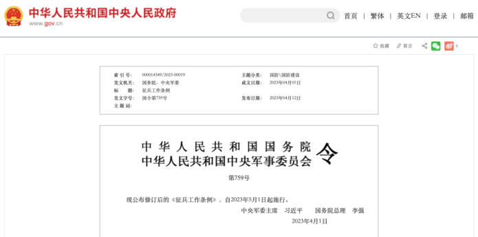 2023年4月12日,國(guó)務(wù)院網(wǎng)站公布新修訂的《征兵工作條例》:
