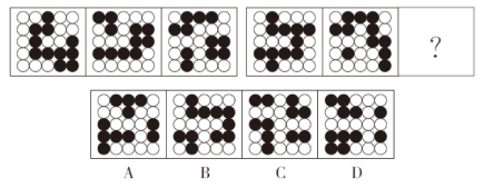 【答案】A【解析】題干圖形均由黑色圓圈和白色圓圈組成,考慮兩種圓圈的數量性和位置性規(guī)律,但是沒有位置規(guī)律,考慮小黑球或者小白球的部分數,相連小黑球作為一部分,每組圖形中,黑色圓圈部分數依次為1、2、3,選項中只有A項黑色圓圈部分數為3。故本題選A。