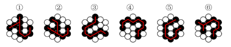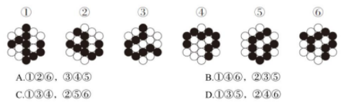 【答案】C【解析】第一步,觀察特征。圖形都由黑色小球和白色小球組成,且所有圓圈都連在一起,故有可能考慮自身特性或數量關系方向的規(guī)律。又黑色小球部分數均為1,考慮連線的筆畫數的規(guī)律。第二步,根據規(guī)律進行分組。如下圖所示,圖形①②⑥中黑色小球的連線為2筆畫,圖形③④⑤中黑色小球的連線為1筆畫,分為兩組。