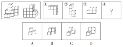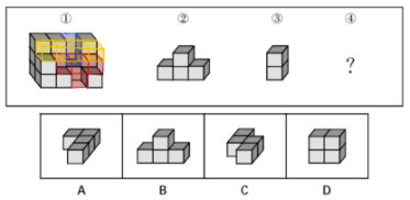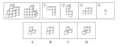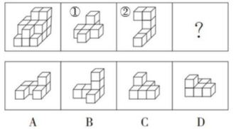第二步:已知1和2和3一共有個16小立方體,所以還需要6個立方體方能拼成,滿足此個數要求的只有D項,因此該題選D。