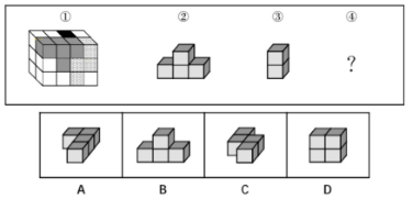 例2:從所給的四個選項中,選擇最合適的一個填入問號處,使下圖中的立體圖形①、②、③和④可組成一個完整的長方體。( )