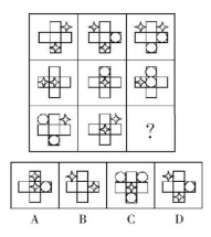 【答案】C【解析】觀察前兩行圖形可以發(fā)現,前兩個圖形疊加得到第三個圖形,疊加規(guī)律為:星星+空白=星星,星星+星星=圓,圓+空白=圓。