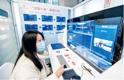 圖為2022年11月15日,群眾在北京城市副中心政務服務中心“法智小屋”通過平臺向律師視頻咨詢。北京市通州區(qū)司法局設置的“法智小屋”,可以網上對接法律咨詢、法治體檢、公證業(yè)務、法律援助等多種公共法律服務。中央政法委供圖