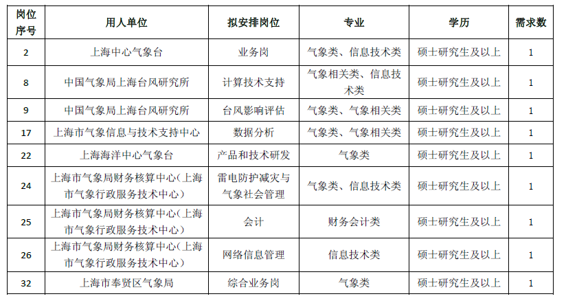 上海市氣象局所屬事業(yè)單位2023年度高校畢業(yè)生補(bǔ)充招聘計(jì)劃表