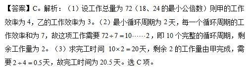 例1:完成某片果園的采摘工作,甲單獨完成需要18天,乙單獨完成需要24天,現(xiàn)按照甲、乙、甲、乙、……的順序輪流采摘,每人1天,那么完成這項工作需要多長時間?( )