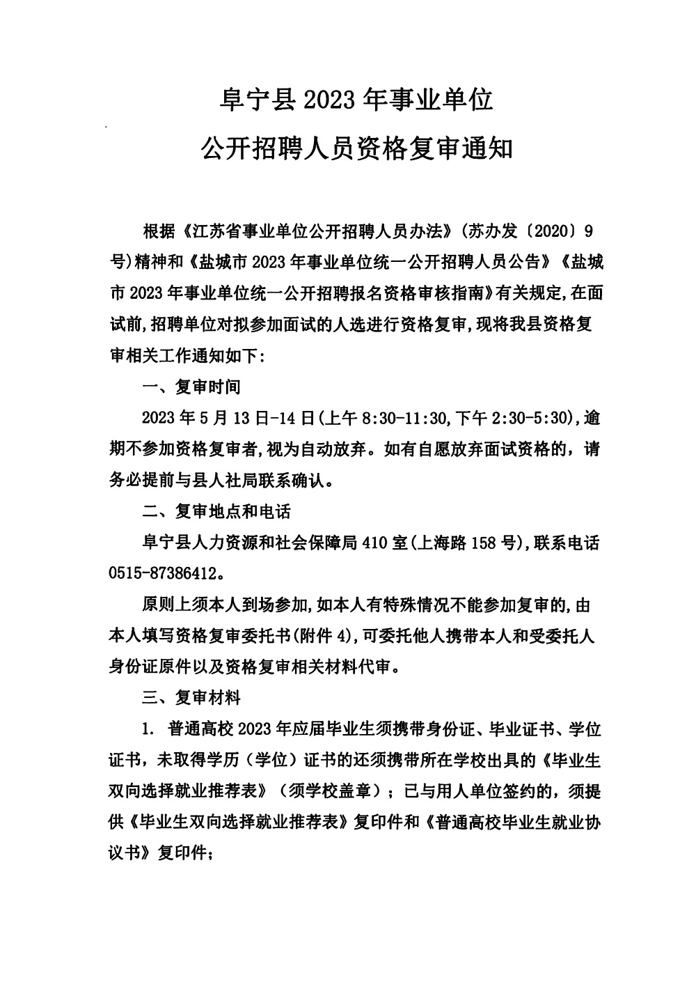 阜寧縣2023年事業(yè)單位公開招聘人員資格復審通知