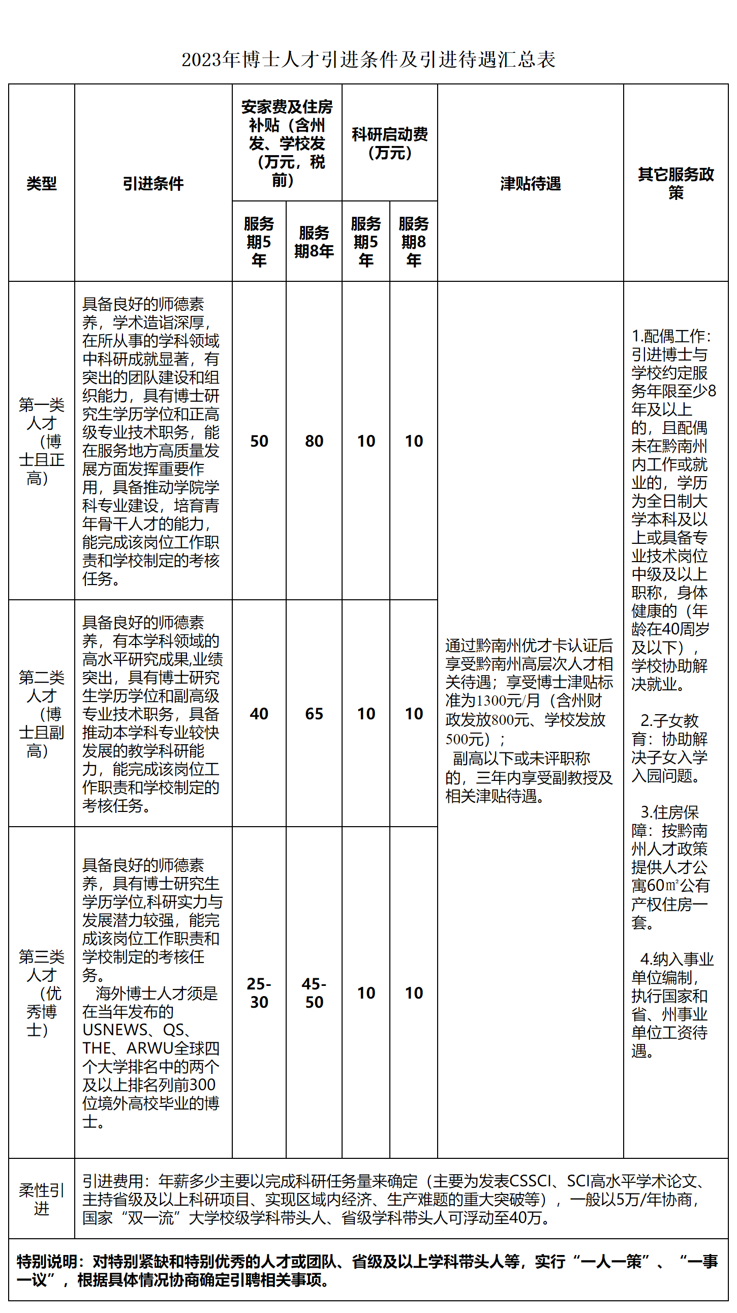 2023年博士人才引進(jìn)條件及引進(jìn)待遇匯總表類型引進(jìn)條件安家費(fèi)及住房補(bǔ)貼(含州發(fā)、學(xué)校發(fā)(萬元,稅前)科研啟動(dòng)費(fèi)(萬元)津貼待遇其它服務(wù)政策服務(wù)期5年服務(wù)期8年服務(wù)期5年服務(wù)期8年第一類人才(博士且正高)具備良好的師德素養(yǎng),學(xué)術(shù)造詣深厚,在所從事的學(xué)科領(lǐng)域中科研成就顯著,有突出的團(tuán)隊(duì)建設(shè)和組織能力,具有博士研究生學(xué)歷學(xué)位和正高級(jí)專業(yè)技術(shù)職務(wù),能在服務(wù)地方高質(zhì)量發(fā)展方面發(fā)揮重要作用,具備推動(dòng)學(xué)院學(xué)科專業(yè)建設(shè),培育青年骨干人才的能力,能完成該崗位工作職責(zé)和學(xué)校制定的考核任務(wù)。50801010通過黔南州優(yōu)才卡認(rèn)證后享受黔南州高層次人才相關(guān)待遇;享受博士津貼標(biāo)準(zhǔn)為1300元/月(含州財(cái)政發(fā)放800元、學(xué)校發(fā)放500元);副高以下或未評(píng)職稱的,三年內(nèi)享受副教授及相關(guān)津貼待遇。1.配偶工作:引進(jìn)博士與學(xué)校約定服務(wù)年限至少8年及以上的,且配偶未在黔南州內(nèi)工作或就業(yè)的,學(xué)歷為全日制大學(xué)本科及以上或具備專業(yè)技術(shù)崗位中級(jí)及以上職稱,身體健康的(年齡在40周歲及以下),學(xué)校協(xié)助解決就業(yè)。 2.子女教育:協(xié)助解決子女入學(xué)入園問題。 3.住房保障:按黔南州人才政策提供人才公寓60㎡公有產(chǎn)權(quán)住房一套。 4.納入事業(yè)單位編制,執(zhí)行國(guó)家和省、州事業(yè)單位工資待遇。第二類人才(博士且副高)具備良好的師德素養(yǎng),有本學(xué)科領(lǐng)域的高水平研究成果,業(yè)績(jī)突出,具有博士研究生學(xué)歷學(xué)位和副高級(jí)專業(yè)技術(shù)職務(wù),具備推動(dòng)本學(xué)科專業(yè)較快發(fā)展的教學(xué)科研能力,能完成該崗位工作職責(zé)和學(xué)校制定的考核任務(wù)。40651010第三類人才(優(yōu)秀博士)具備良好的師德素養(yǎng),具有博士研究生學(xué)歷學(xué)位,科研實(shí)力與發(fā)展?jié)摿^強(qiáng),能完成該崗位工作職責(zé)和學(xué)校制定的考核任務(wù)。 海外博士人才須是在當(dāng)年發(fā)布的USNEWS、QS、THE、ARWU全球四個(gè)大學(xué)排名中的兩個(gè)及以上排名列前300位境外高校畢業(yè)的博士。25-3045-501010柔性引進(jìn)引進(jìn)費(fèi)用:年薪多少主要以完成科研任務(wù)量來確定(主要為發(fā)表CSSCI、SCI高水平學(xué)術(shù)論文、主持省級(jí)及以上科研項(xiàng)目、實(shí)現(xiàn)區(qū)域內(nèi)經(jīng)濟(jì)、生產(chǎn)難題的重大突破等),一般以5萬/年協(xié)商,國(guó)家“雙一流”大學(xué)校級(jí)學(xué)科帶頭人、省級(jí)學(xué)科帶頭人可浮動(dòng)至40萬。特別說明:對(duì)特別緊缺和特別優(yōu)秀的人才或團(tuán)隊(duì)、省級(jí)及以上學(xué)科帶頭人等,實(shí)行“一人一策”、“一事一議”,根據(jù)具體情況協(xié)商確定引聘相關(guān)事項(xiàng)。