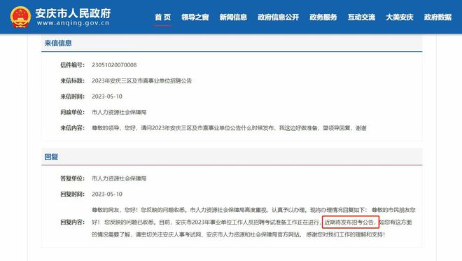 根據(jù)安慶市人民政府官方回復(fù),2023年安慶市事業(yè)單位招聘公告將在近期發(fā)布,以下是相關(guān)原文: