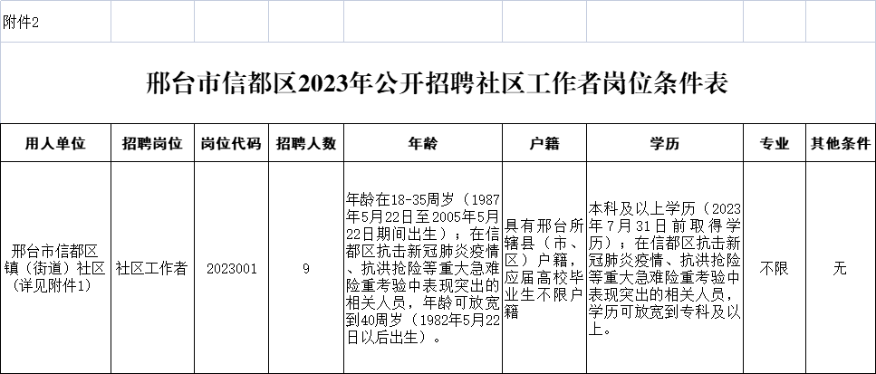 1.招聘崗位人數(shù)和其他具體條件詳見《邢臺市信都區(qū)2023年公開招聘社區(qū)工作者崗位條件表》(附件2),國外留學生須出具教育部留學認證中心提供的學歷學位認證書。