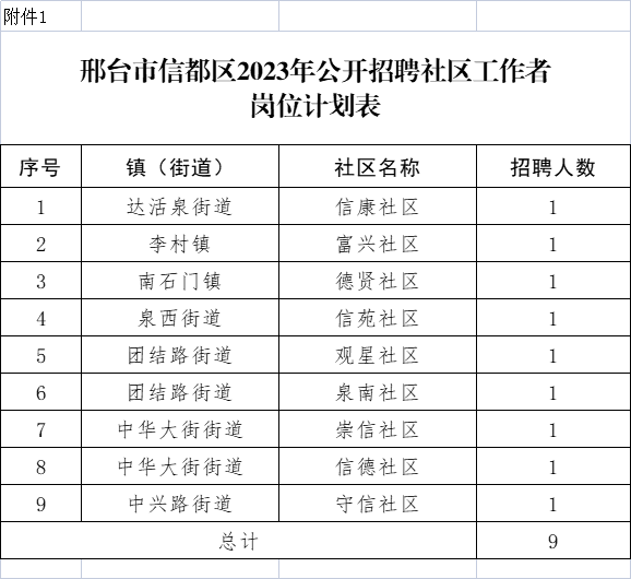 公開招聘社區(qū)工作者共9名,具體崗位計劃詳見《邢臺市信都區(qū)2023年公開招聘社區(qū)工作者崗位計劃表》(附件1)。