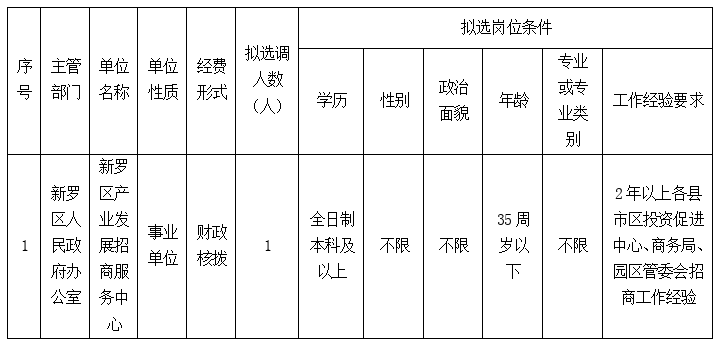 龍巖市新羅區(qū)產(chǎn)業(yè)發(fā)展招商服務(wù)中心業(yè)務(wù)股室干部1名(事業(yè)),詳見(jiàn)下表。
