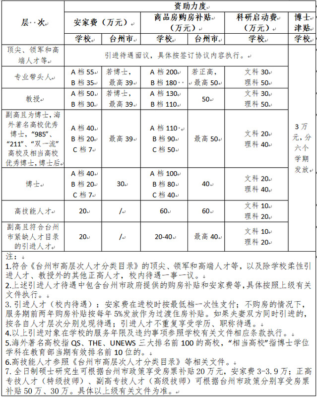 聘用人員除按國(guó)家有關(guān)規(guī)定享受工資、保險(xiǎn)等待遇外,符合我校高層次人才標(biāo)準(zhǔn)的,將提供購(gòu)房補(bǔ)貼、安家費(fèi)、科研啟動(dòng)費(fèi)等方面的待遇。具體見下表: