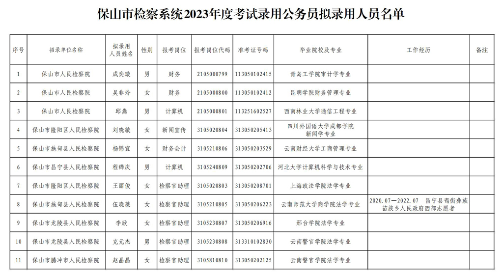 附:保山市檢察系統(tǒng)2023年度考試錄用公務(wù)員擬錄用人員名單