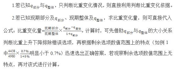 其次,根據材料所給的數據條件,觀察材料是否直接給出現期比重與基期比重,若直接給出,則直接用公式1;若未給,則需結合所給的現期部分值與部分增長率、現期整體值與整體增長率以及公式2列式;