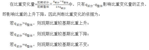 根據比重變化量公式可判斷比重變化情況:若比重變化量>0,則比重上升;若比重變化量<0,則比重下降;若比重變化量=0,則比重不變。